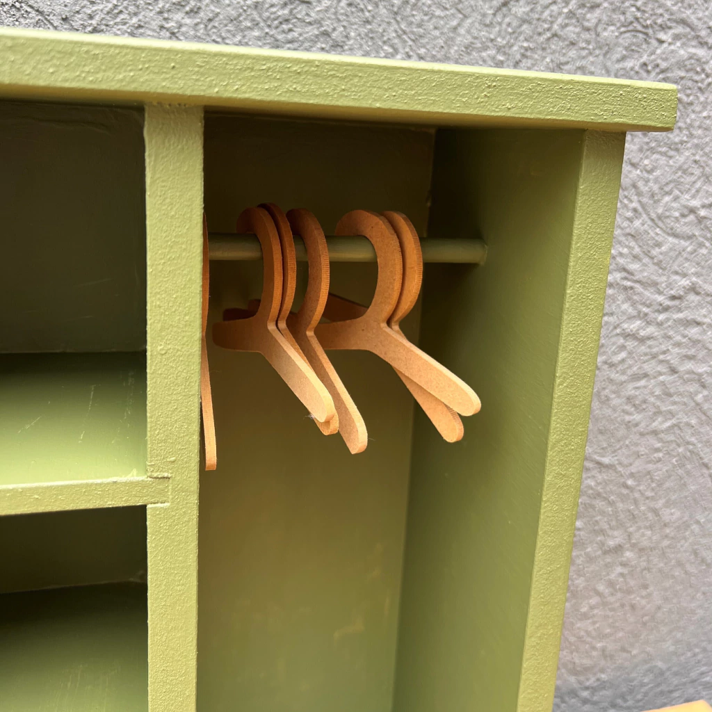 Ropero de madera para guardar la ropa de las muñecas.